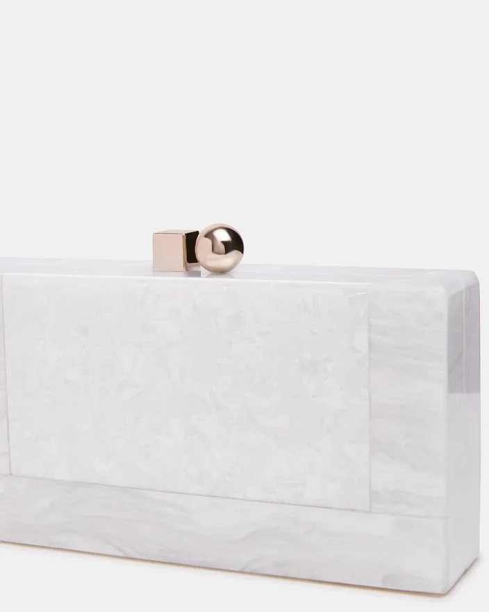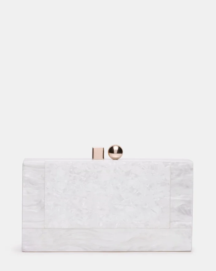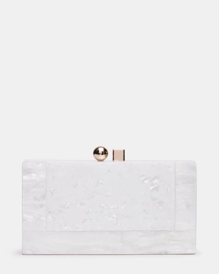 The Camilaa Bag White Combines Sophisticated Elegance with Practical Versatility. Crafted from Lustrous Faux Mother-Of-Pearl with a Pearlescent Finish, This Minaudiere Features a Striking Geometric Metal Closure That Adds Contemporary Polish. The Structured Hard Case Design Protects Your Essentials While Maintaining a Refined Silhouette Perfect for Evening Occasions or Upscale Daytime Wear. Inside, a Standard Lining and Card Slot Keep Necessities Organized and Accessible. The Included Chain Crossbody Strap Offers Flexible Styling—Carry It as a Clutch or Wear It Hands-Free for Effortless Transition from Event to Event.