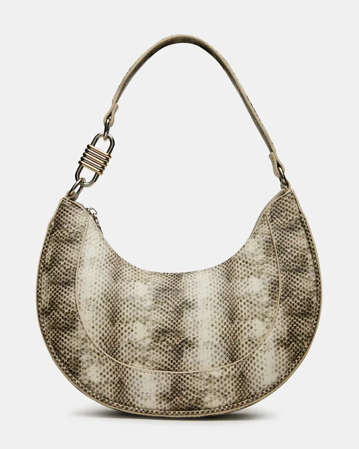 The Lohan Bag Bone/Multi Bag is a Structured Crescent Hobo Shoulder Bag That Features a Distinctive Statement Hardware Piece, Elevating Its Stylish Appeal. Designed for Both Function and Fashion, It Includes Two Front Zip Compartments and an Interior Back Wall Pocket, Offering Organized Storage for Essentials. Its Shape and Sturdy Construction Ensure It Maintains Form While Providing Comfortable Shoulder Carry, Making It a Versatile Accessory for Refined Everyday Wear.