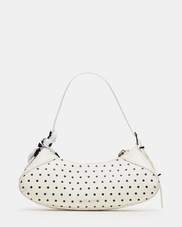 The Roxey Bag Dots Combines Sophisticated Design with Practical Functionality. This Crescent-Shaped Shoulder Bag Features a Secure Top-Zipper Closure and Arrives with an Attachable Knotted Scarf for Versatile Styling Options. Interior Organization is Enhanced with Dedicated Pouch Compartments on Both the Back and Front Walls, Ensuring Your Essentials Stay Organized and Accessible. The Polished Silhouette Makes It an Effortless Addition to Any Wardrobe, Transitioning Seamlessly from Day to Evening Wear.