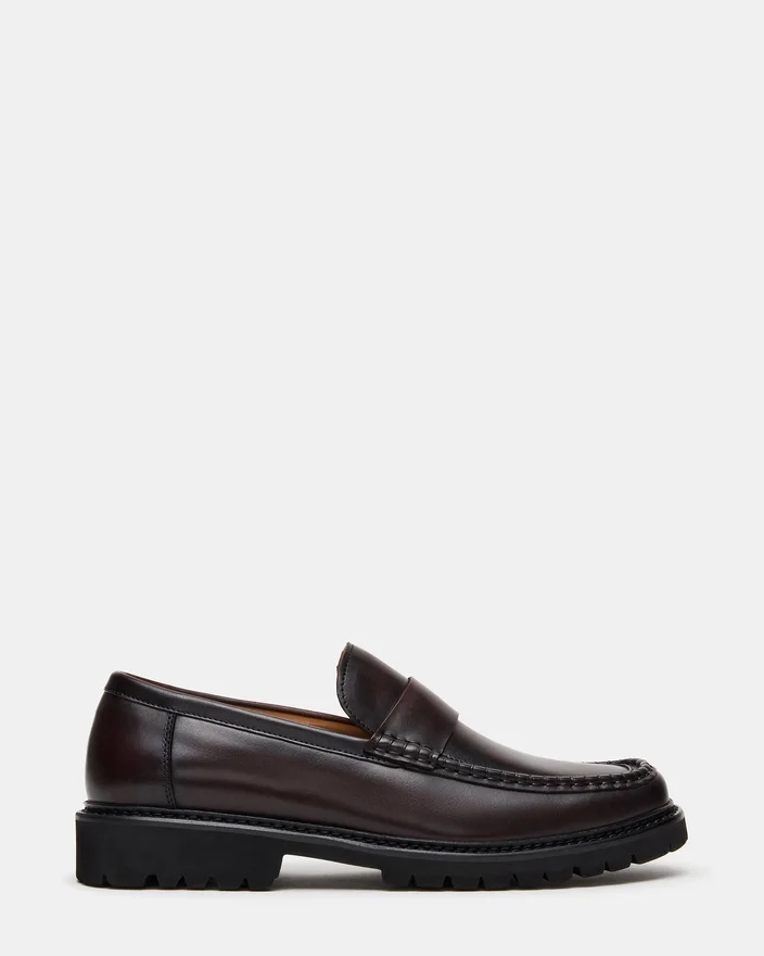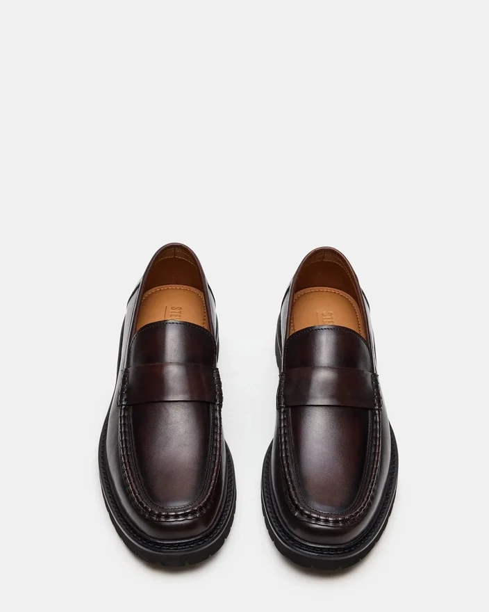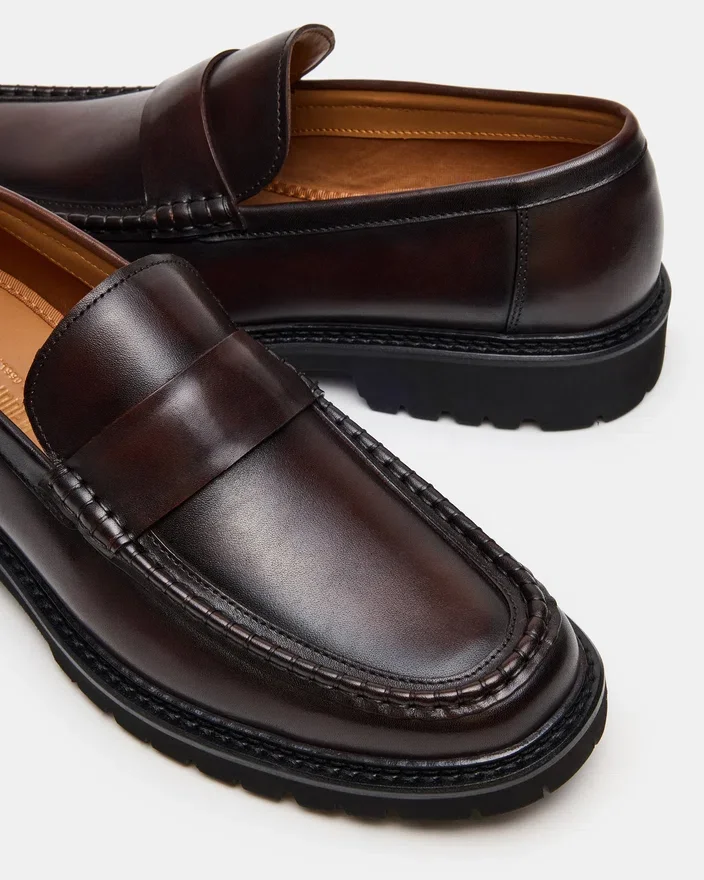 The Brodie Brown Slip-On Loafer Combines Timeless Silhouette with Contemporary Edge, Featuring a Lug Sole. This Versatile Style Transitions Seamlessly from Casual Weekends to Polished Professional Settings.