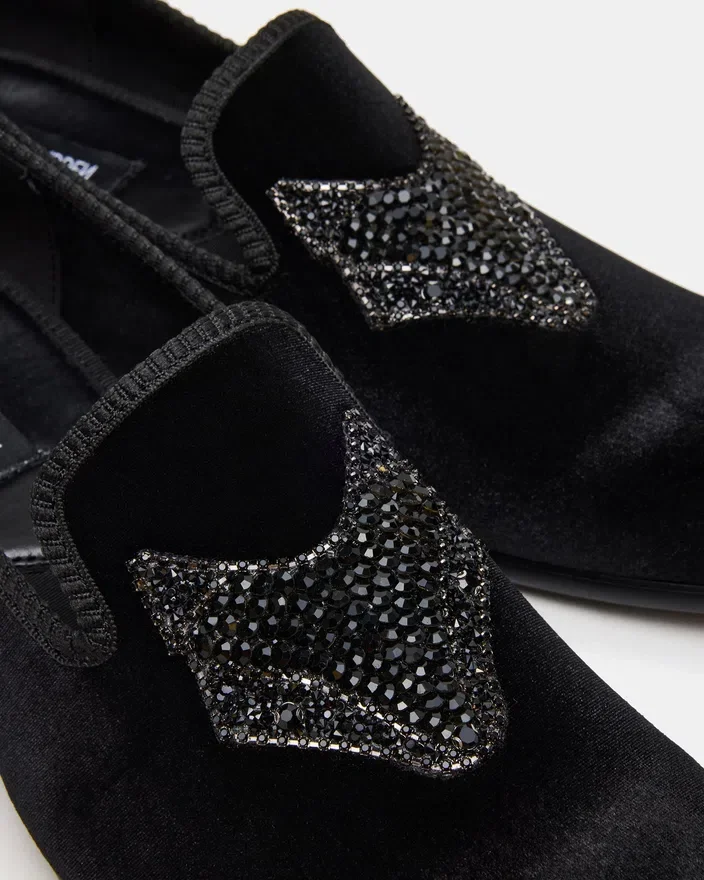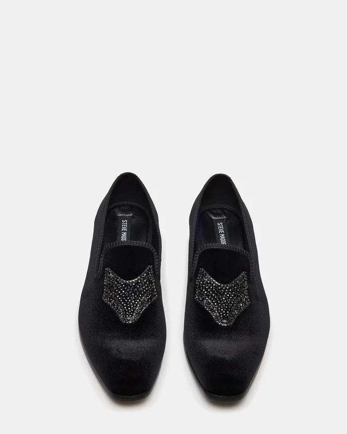 Elevate Your Footwear Collection with the Finn Black Velvet, a Sophisticated Slip-On Loafer Crafted from Luxurious Materials and Adorned with a Striking Rhinestone Fox Head Embellishment. This Refined Design Seamlessly Transitions from Casual to Dressy Occasions, Offering Both Comfort and Distinctive Style.