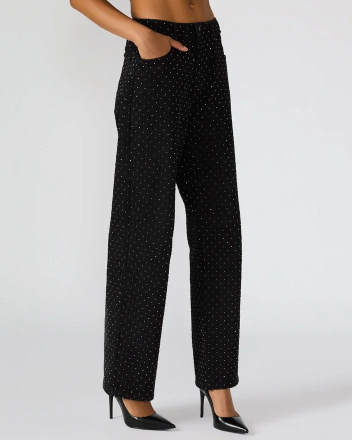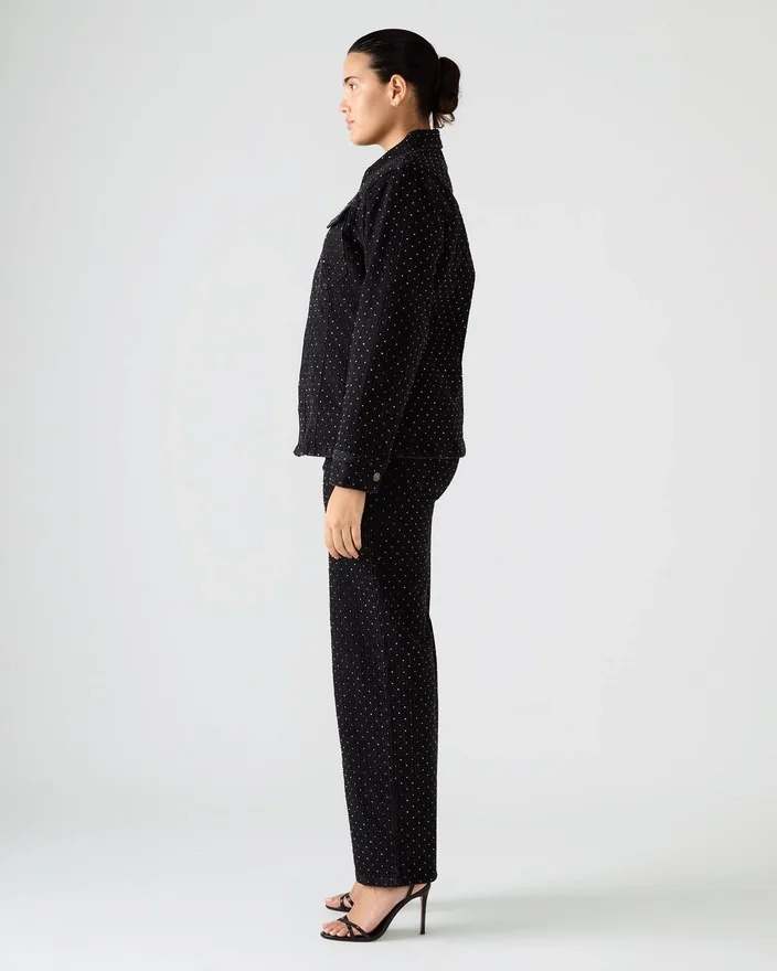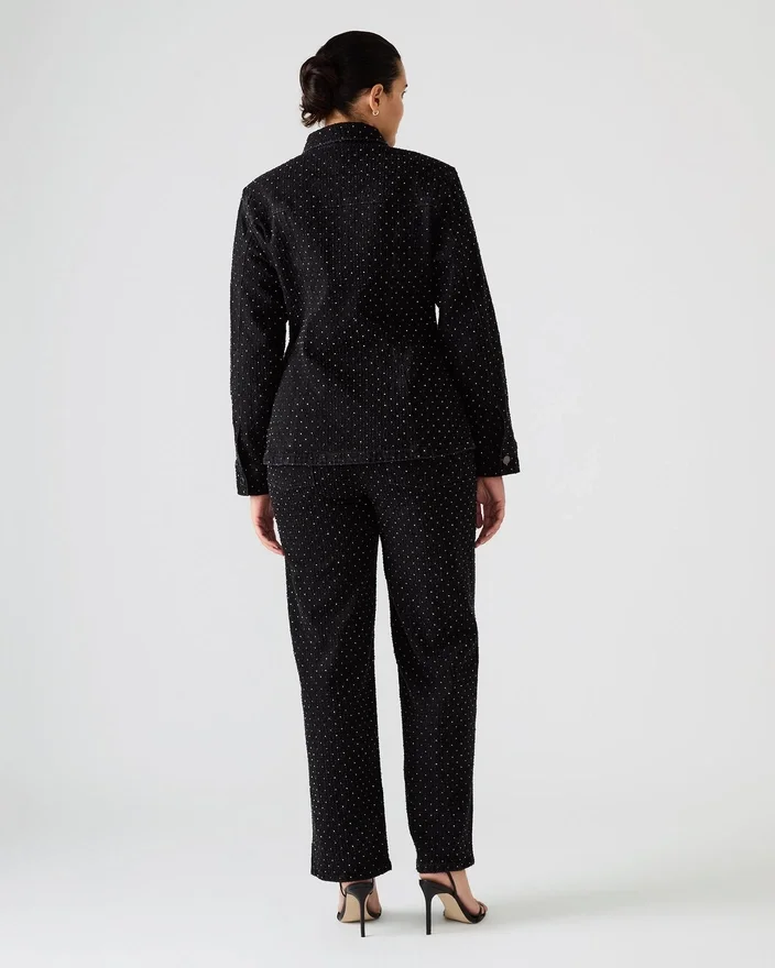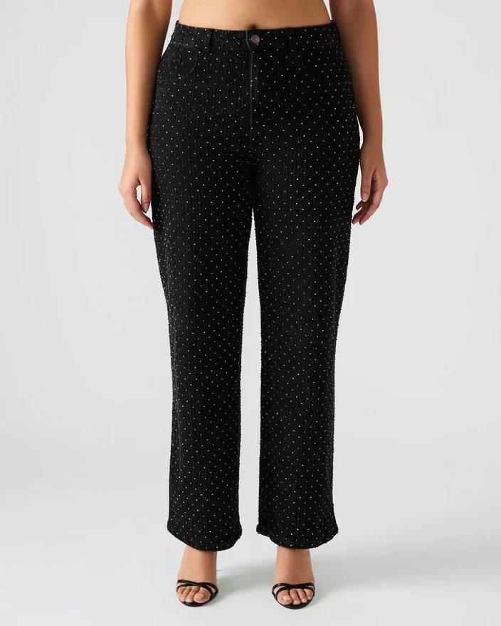 These Avaline Crystal Jean Black Straight-Leg Denim Jeans Feature a Sleek Wash Enhanced with Meticulously Placed Rhinestone Embellishments, Adding a Refined Sparkle to Your Wardrobe. Designed with Practical Front and Back Pockets, They Combine Fashion-Forward Style with Everyday Functionality. Perfect for Elevating Casual Looks with a Touch of Sophistication.