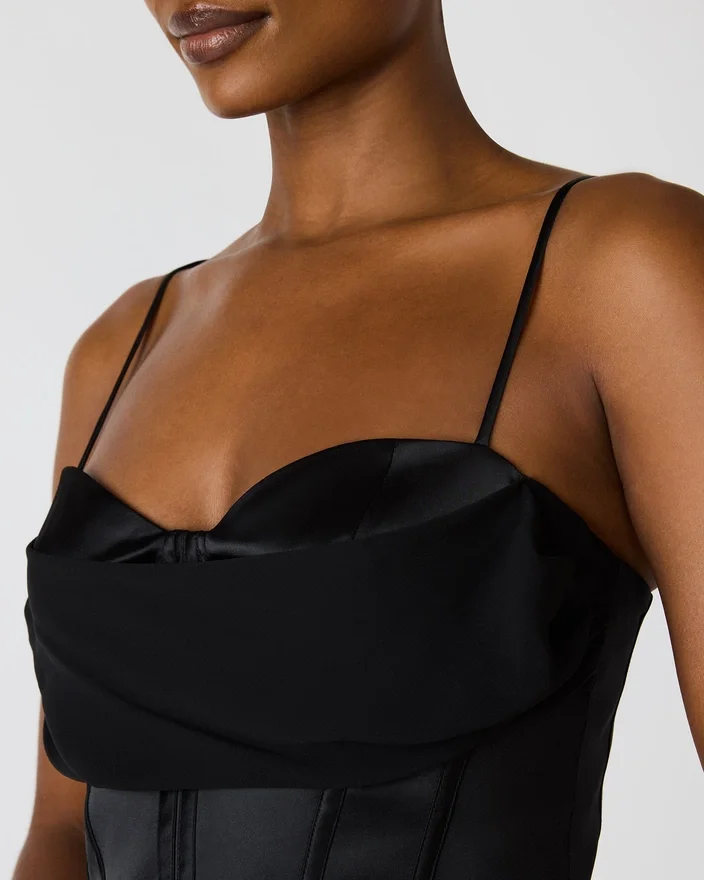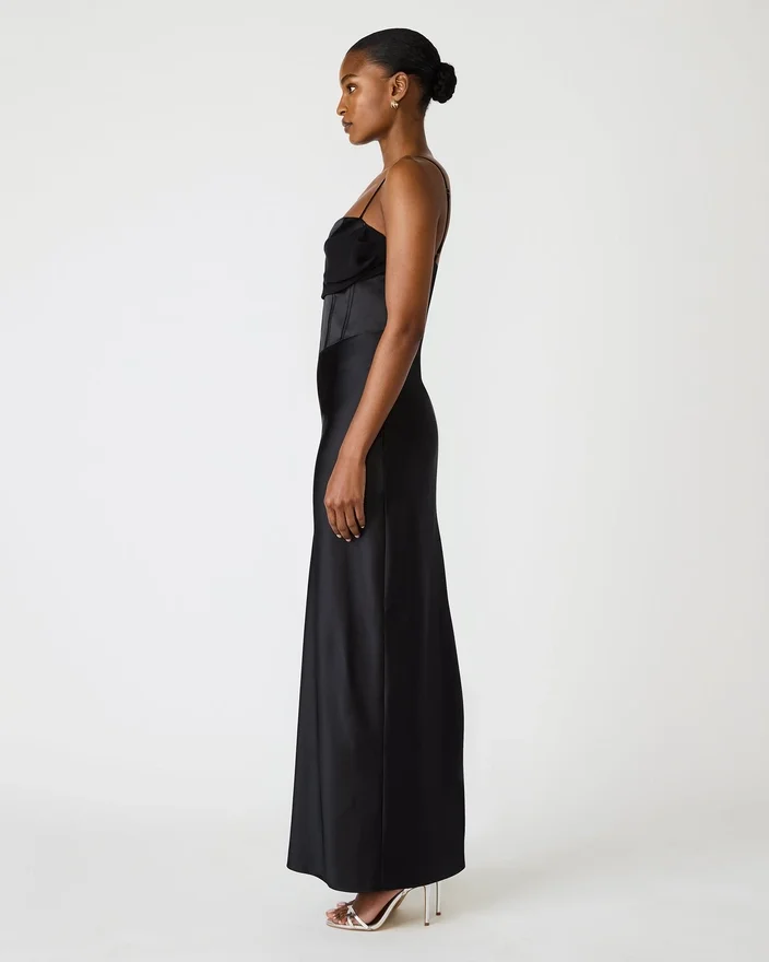 The Carmela Dress Black Combines Timeless Elegance with Modern Sophistication. Crafted from Luxuriously Satin Fabric, This Maxi Dress Features a Structured Bustier Bodice That Provides Flattering Support and Definition. Adjustable Straps Allow for a Customized Fit, While the Convenient Back-Zipper Closure Ensures Effortless Dressing. Perfect for Evening Events, Special Occasions, or Elevated Everyday Wear, This Versatile Piece Transitions Seamlessly from Day to Night.