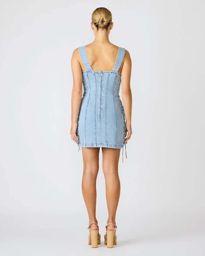 Elevate Your Denim Game with This Chic Gianka Dress Hazey Blue Featuring a Flattering Square Neckline and Edgy Lace-Up Side Detailing. The Convenient Zipper Back Closure Ensures an Easy Fit, While the Classic Denim Construction Offers Timeless Versatility. Perfect for Casual Outings or Dressed-Up Occasions, This Piece Transitions Seamlessly from Day to Night.