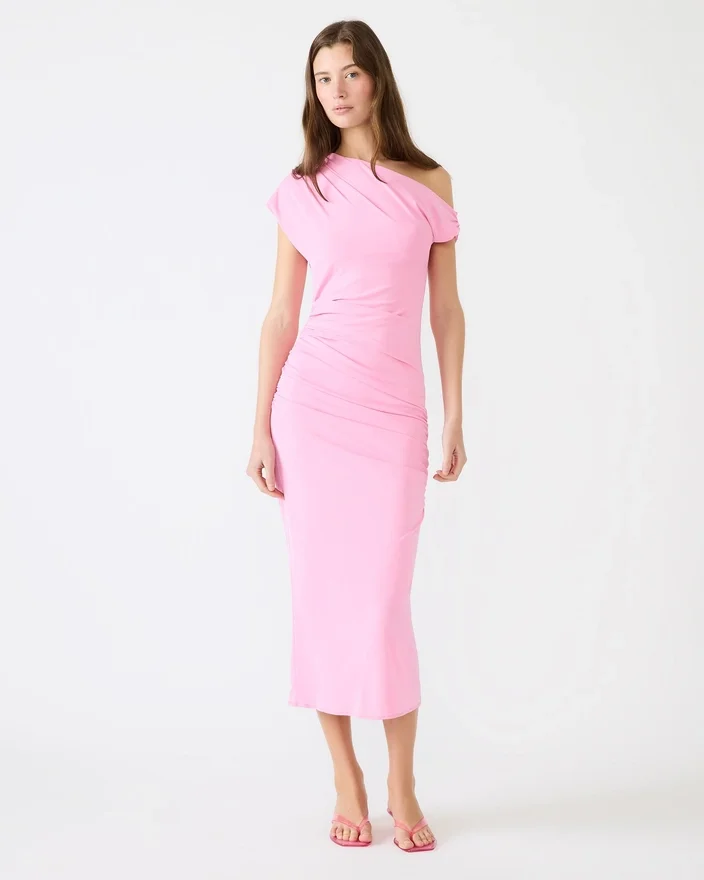 Make a Statement in the Gracelyn Dress Pink Taffy Featuring an Eye-Catching Asymmetrical Neckline That Adds Modern Sophistication. Strategic Side Ruching Creates Flattering Dimension and a Sleek, Polished Silhouette. Perfect for Date Nights, Cocktail Events, or Whenever You Want to Turn Heads. The Bodycon Midi Length Offers Versatility with Heels or Flats, Making It an Essential Piece for Any Occasion-Ready Wardrobe.