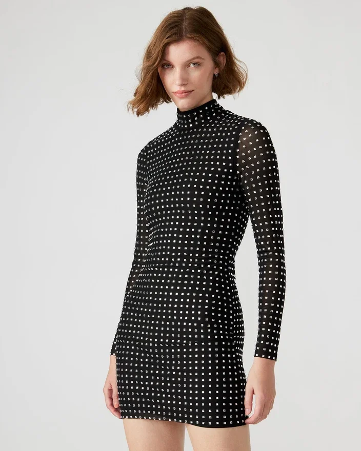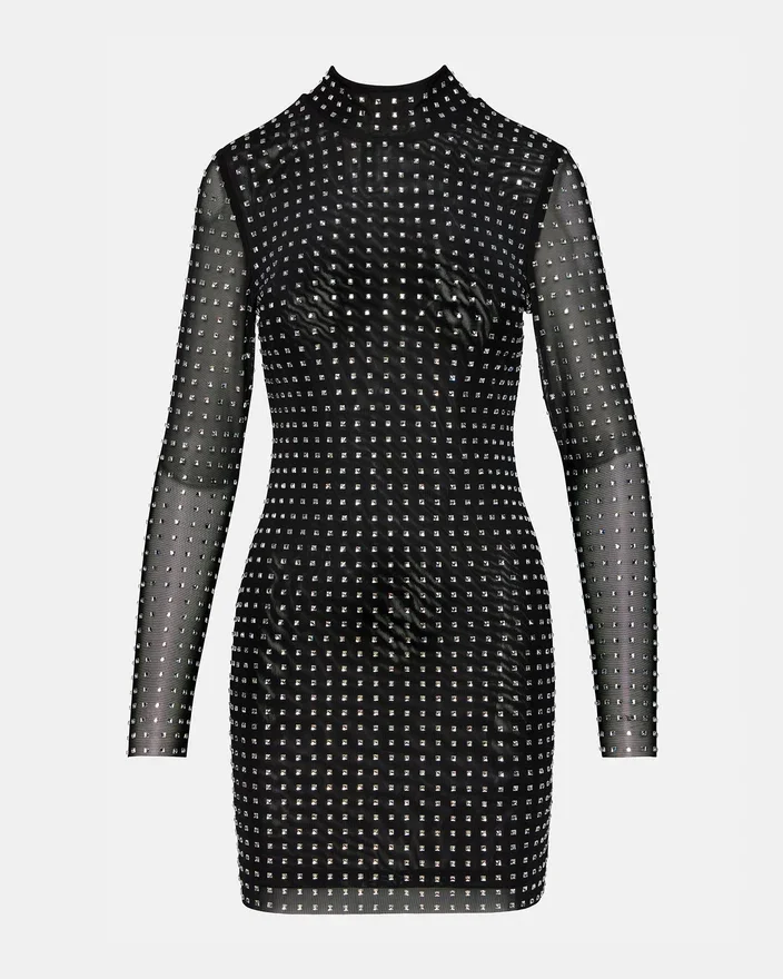 Elevate Your Style with Our Krista Dress. This Long-Sleeved Mini Dress Features a Mock Neck and Back Zipper Closure. This Stunning Dress Also Features Unique Square-Shaped Rhinestone Stud Embellishments for a Touch of Glamour. Make a Statement with This Elegant and Sophisticated Piece, Perfect for Any Occasion.