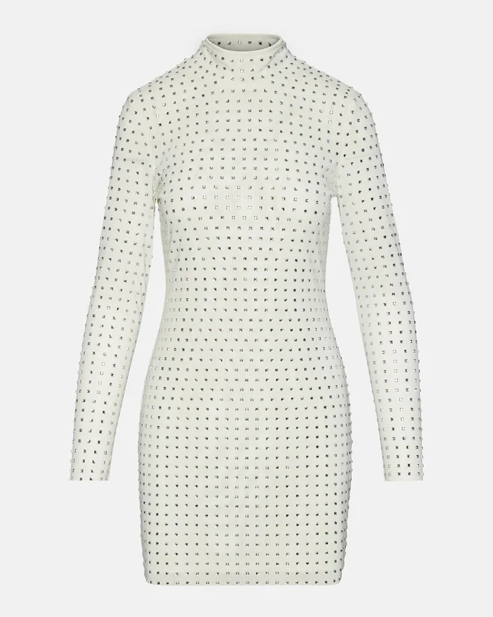 Elevate Your Style with Our Krista Dress. This Long-Sleeved Mini Dress Features a Mock Neck and Back Zipper Closure. This Stunning Dress Also Features Unique Square-Shaped Rhinestone Stud Embellishments for a Touch of Glamour. Make a Statement with This Elegant and Sophisticated Piece, Perfect for Any Occasion.