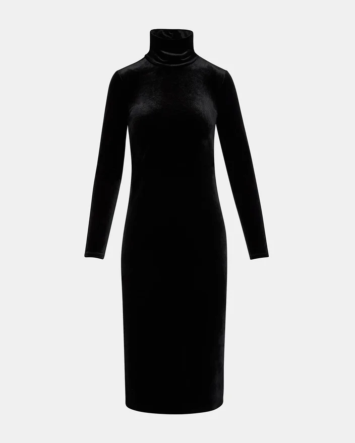 Experience Comfort and Style with the Skyler Dress. This Long-Sleeved Turtleneck Velvet Dress Offers a Chic and Modern Look, While the Midi Length Provides Versatility for Any Occasion. The Open Back Adds a Touch of Elegance to This Must-Have Dress.
