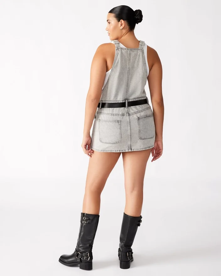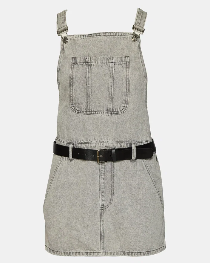 Introducing the Tamia Dress, a Versatile Piece for Your Wardrobe. Crafted in Washed Denim, This Overall-Style Mini Dress Features a Convenient Patch Pocket on the Bodice and a Separate Belt for a Customizable Fit. Dress It up or Down for Any Occasion.