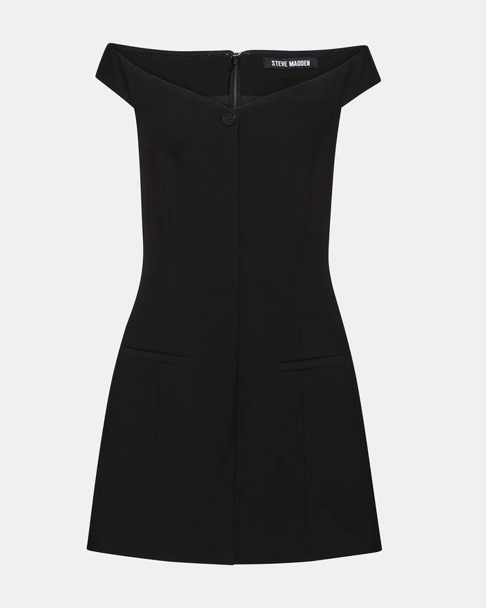 The Yana Dress is a Sophisticated Pleated Mini Dress Designed with an Off-The-Shoulder Neckline That Highlights Elegance. It Features Refined Button Details on the Front and a Back Zipper Closure for a Seamless Fit, Making It a Perfect Choice for Polished, Fashion-Forward Looks.