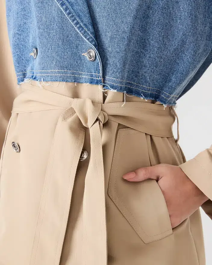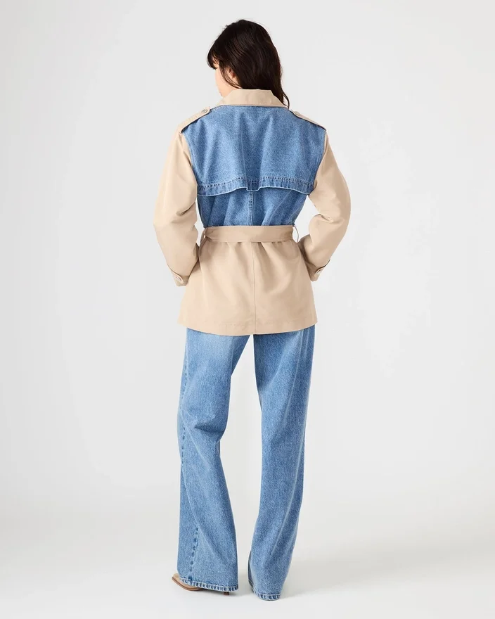 The Shyla Coat Denim Multi Delivers Versatile Layering with Thoughtful Design Details. This Long-Sleeved Button-Up Jacket Features a Classic Collared Neckline and Durable Denim and Khaki Construction That Transitions Seamlessly from Season to Season. Functional Front Pockets Provide Practical Storage, While the Distinctive Tie-Front Closure Adds Dimension and Allows for Customizable Styling. Whether Worn Open over Basics or Buttoned for a Polished Look, This Piece Offers the Structured Comfort and Timeless Appeal That Defines Contemporary Outerwear.