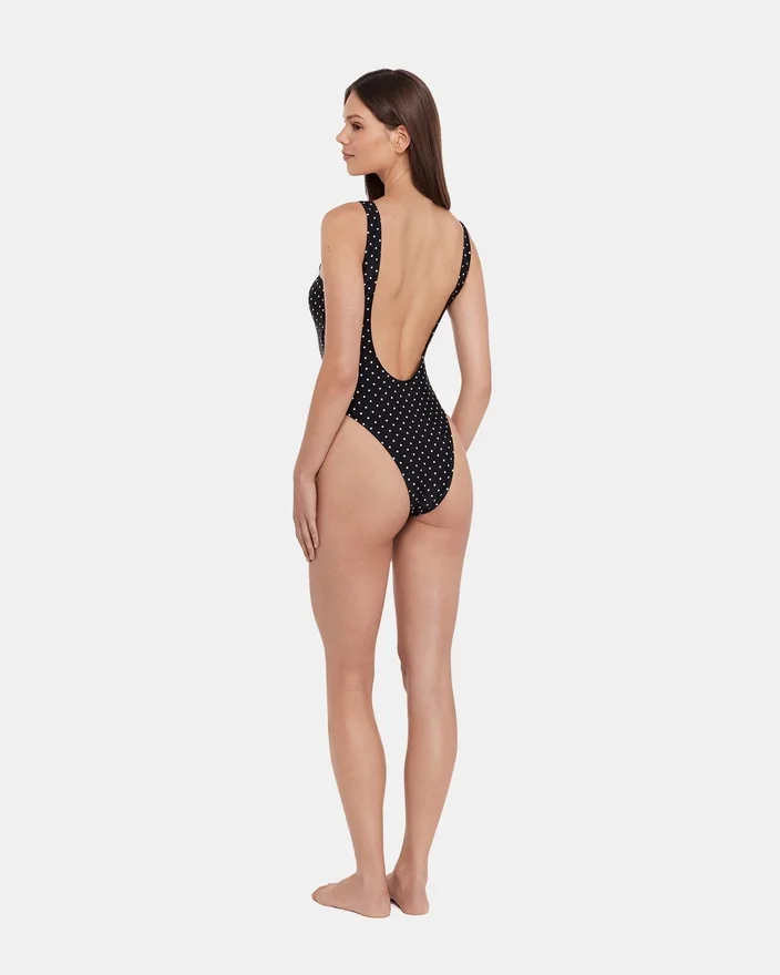 The Darling Dot One Piece Swimsuit Black Multi Delivers Sophistication with Delicate Pearl Accents That Elevate Your Poolside Look. Featuring Cheeky Coverage and Stylish Side Cutouts, This Design Balances Coverage with Modern Flair. Perfect for Individuals Seeking a Statement Piece That Combines Elegance with Contemporary Swimwear.