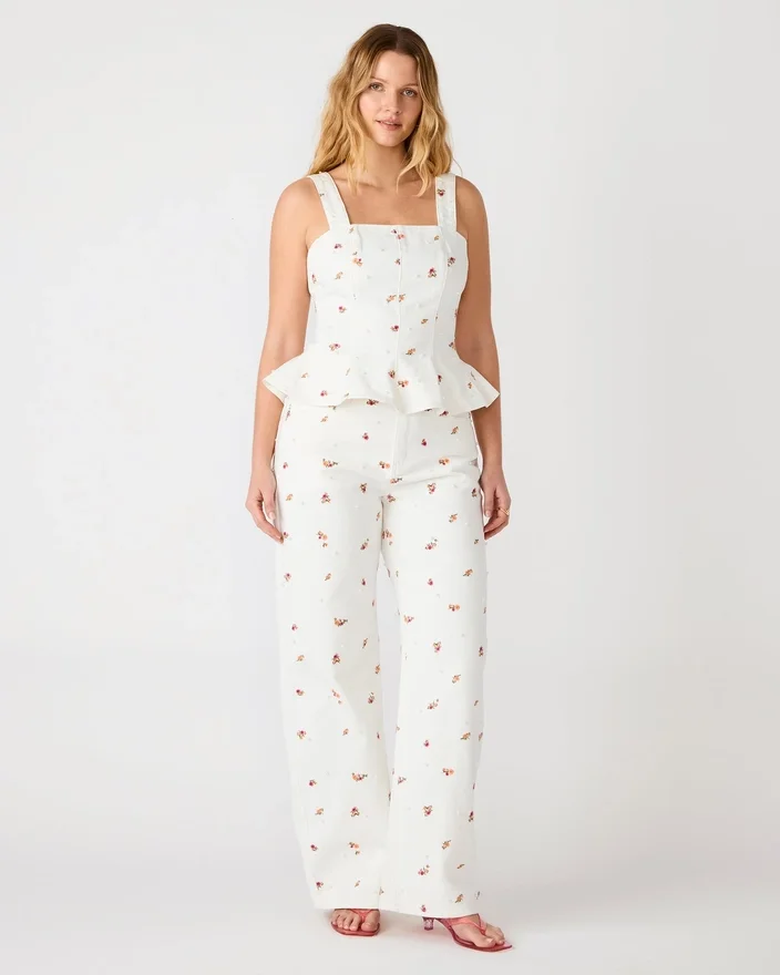The Fiorella Top Antique Combines Contemporary Style with Vintage-Inspired Details. This Denim Sleeveless Top Features a Charming Ruffle-Edged Bottom and Arrives as a Complete Matching Set. Adorned with Vibrant Multi-Colored Floral Embroidery, It Effortlessly Transitions from Casual Daytime Wear to Evening Occasions. The Structured Denim Construction Provides Durability and Shape Retention, While the Thoughtful Design Elements Add Visual Interest and Dimension. Perfect for Layering or Wearing Solo, This Piece Brings an Artisanal Touch to Your Wardrobe.