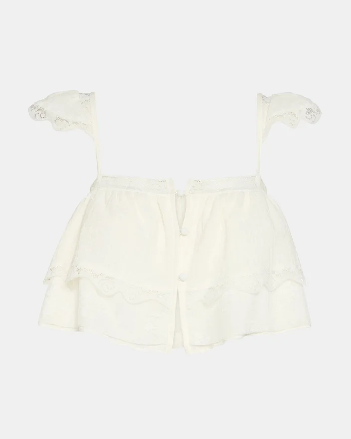 Elevate Your Wardrobe with This Leta Top Snow White Featuring Delicate Lace Trim and Romantic Ruffled Detailing. The Front Button Closure Offers Easy Styling Versatility, While Adjustable Straps Ensure a Customized Fit. Flutter Cap Sleeves Add a Playful, Stylish Touch to This Must-Have Piece. Perfect for Layering or Wearing Solo, This Cropped Top Brings Effortless Elegance to Any Casual Look.