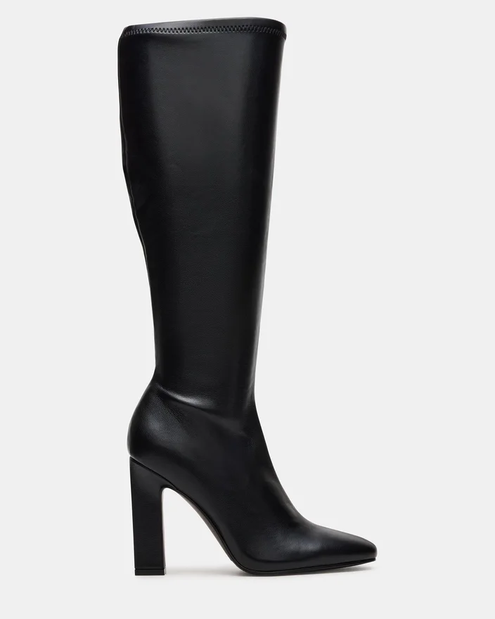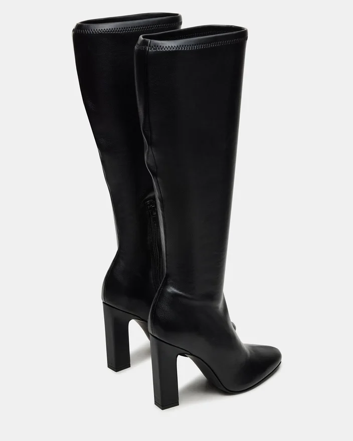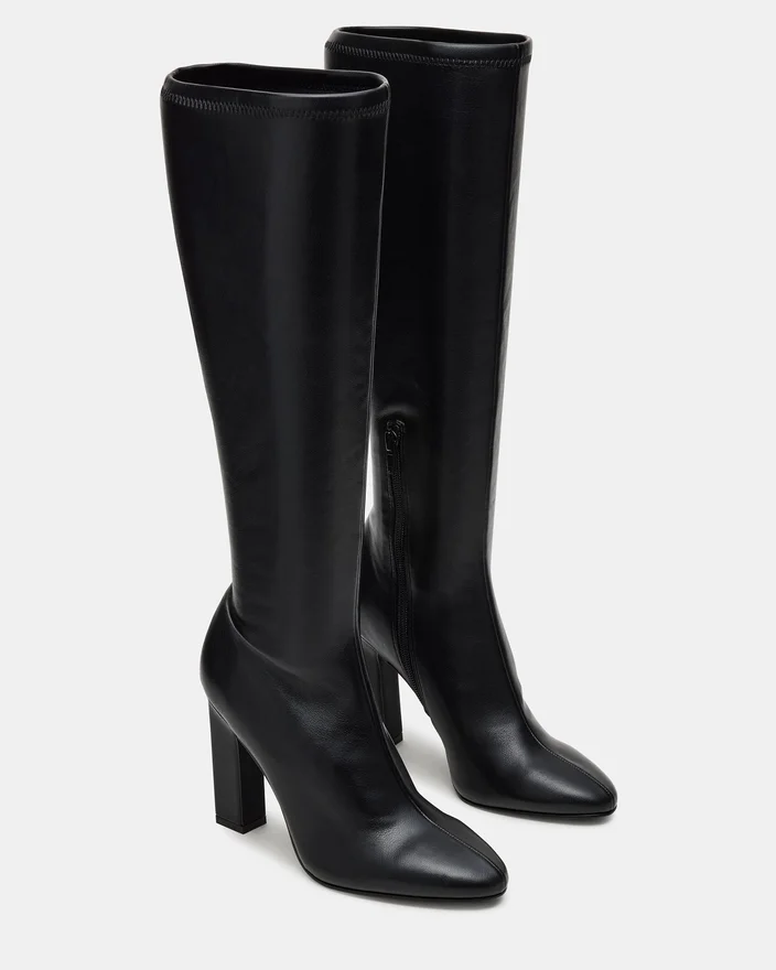 Elevate Your Style with Our Aria Black Wide Calf Knee-High Heeled Boot. Crafted with a Sleek Design, These Boots Will Add a Touch of Sophistication to Any Outfit. You Can Confidently Step out in Style with a Comfortable Heel Height and Secure Fit. Perfect for Any Fashion-Forward Individual.