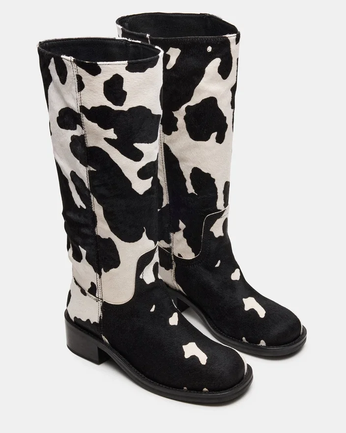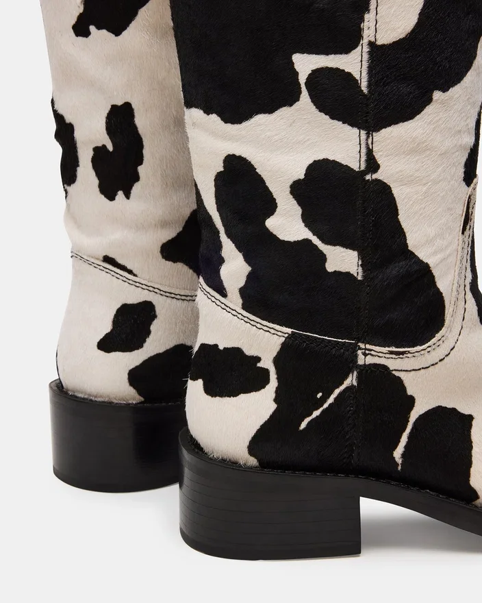 Effortlessly Elevate Your Style with the Riggs Black Cow Print Wide Calf Boot. With Its Square-Toe and Sleek Design, This Just-Under-The-Knee Boot is a Must-Have for Any Fashion-Conscious Individual. This Timeless Boot Provides Both Comfort and Sophistication, Making It the Perfect Addition to Any Outfit.