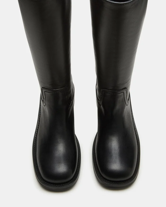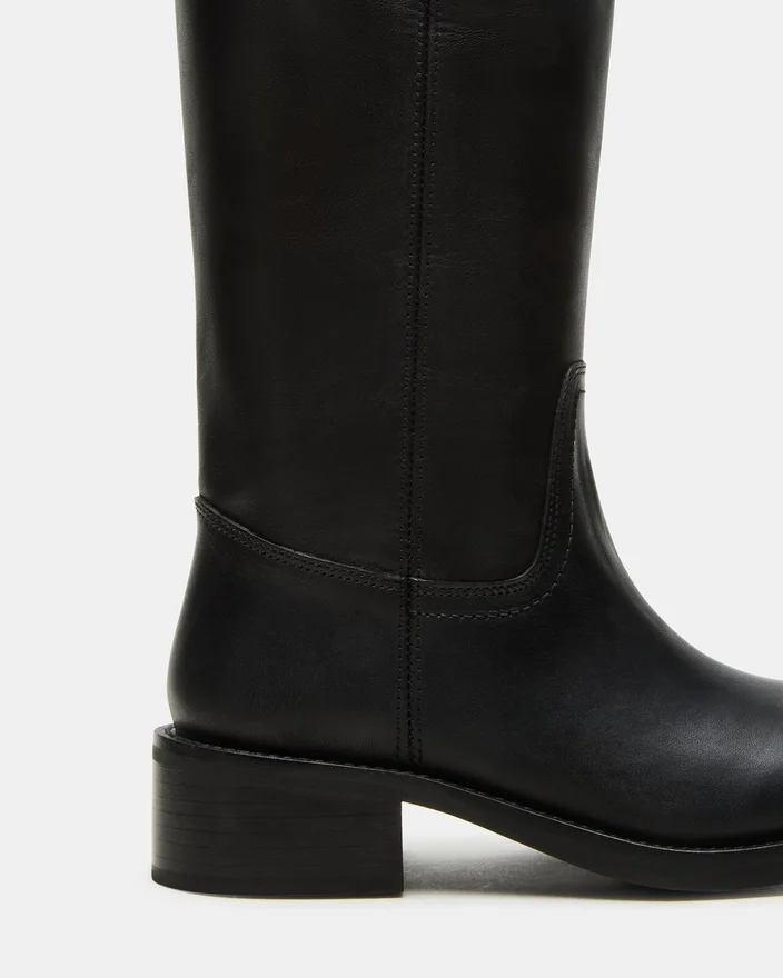 Effortlessly Elevate Your Style with the Riggs Black Leather Wide Calf Boot. With Its Square-Toe and Sleek Design, This Just-Under-The-Knee Boot is a Must-Have for Any Fashion-Conscious Individual. This Timeless Boot Provides Both Comfort and Sophistication, Making It the Perfect Addition to Any Outfit.