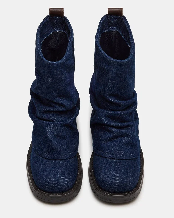 The Benji Denim Fabric Ankle Boot Features a Sophisticated Cuffed Fold-Over Design Combined with a Sleek Moto-Inspired Silhouette. Its Unique Buckle Detail on the Back Adds a Distinctive Edge, Blending Style with Subtle Functionality. Crafted for Both Comfort and Statement-Making Appeal, This Bootie Elevates Any Outfit with Expert Craftsmanship and Contemporary Flair.