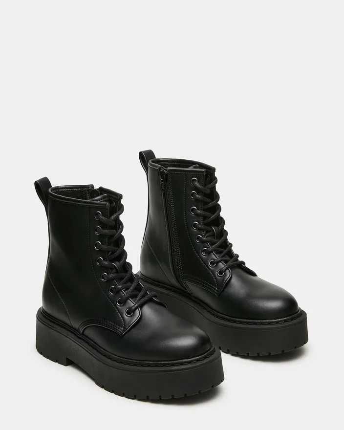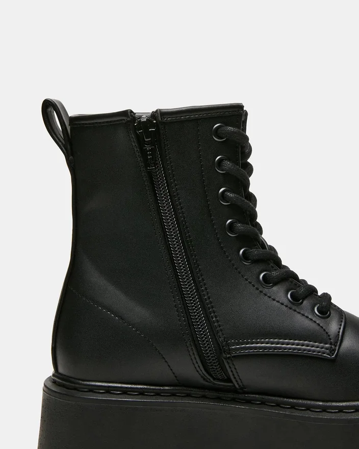 The Buffy Black Combat Bootie Delivers Style with a Refined Edge. This Ankle-Height Lace-Up Features a Structured Silhouette That Commands Attention, Whether Styled with Edgy Outfits or Denim. The Secure Lacing System Ensures a Customizable Fit, While the Platform Sole Adds Both Visual Impact and Practical Elevation. Built for Those Who Appreciate Bold Footwear That Transitions Seamlessly from Day to Night, This Bootie Combines Attitude with Versatility.