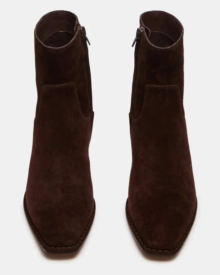 These Define Brown Suede Ankle Boots Feature a Modern Square Toe Design That Blends Contemporary Style with Classic Elegance. Crafted from Quality Materials, They Offer a Refined Texture and Versatile Appeal. The Ankle-Height Silhouette Provides Comfortable Support While Enhancing Your Outfit’s Sophistication. Perfect for Both Casual and Dressy Occasions, These Booties Combine Fashion-Forward Details with Reliable Wearability.