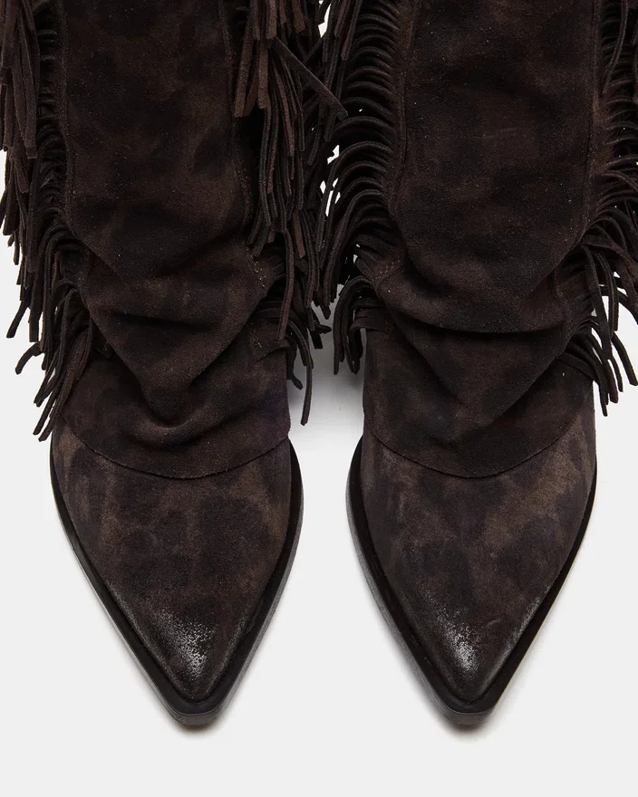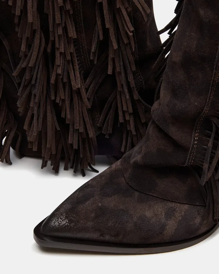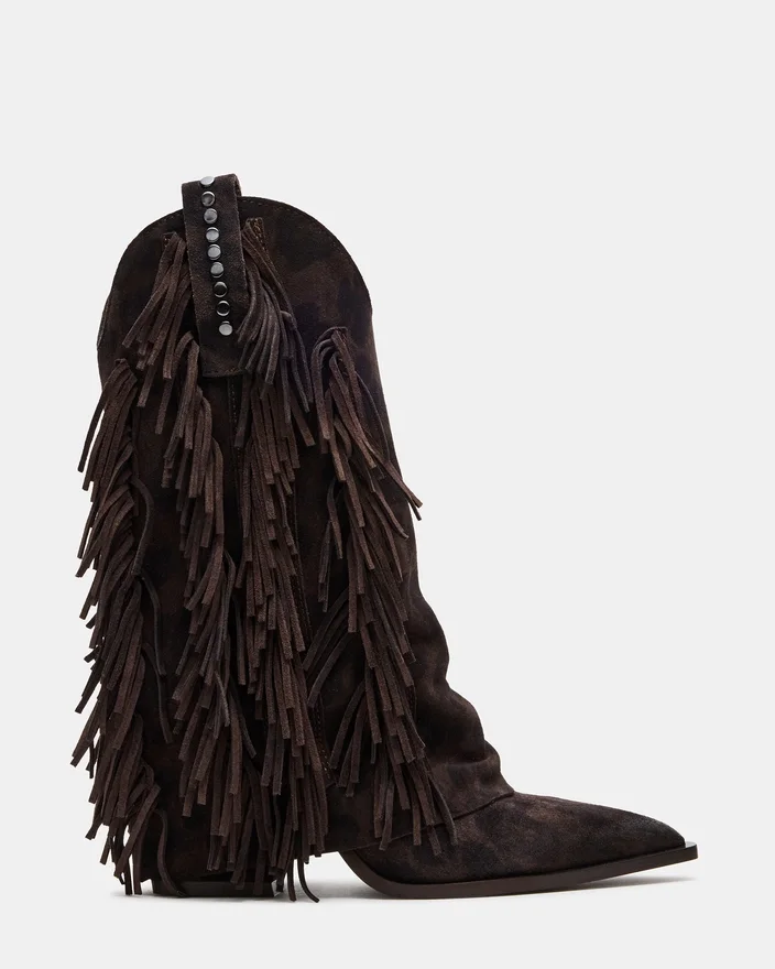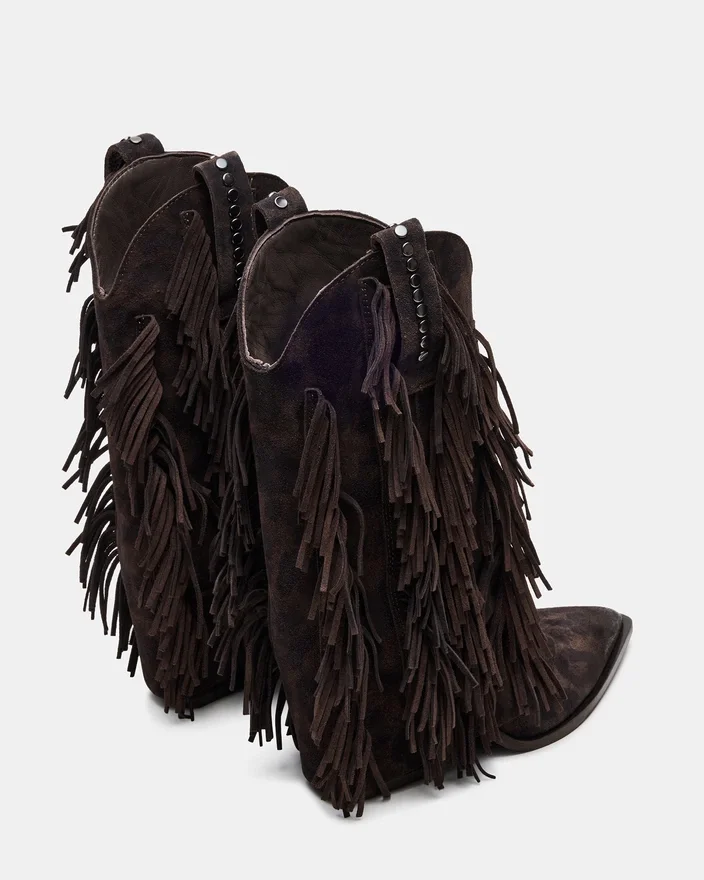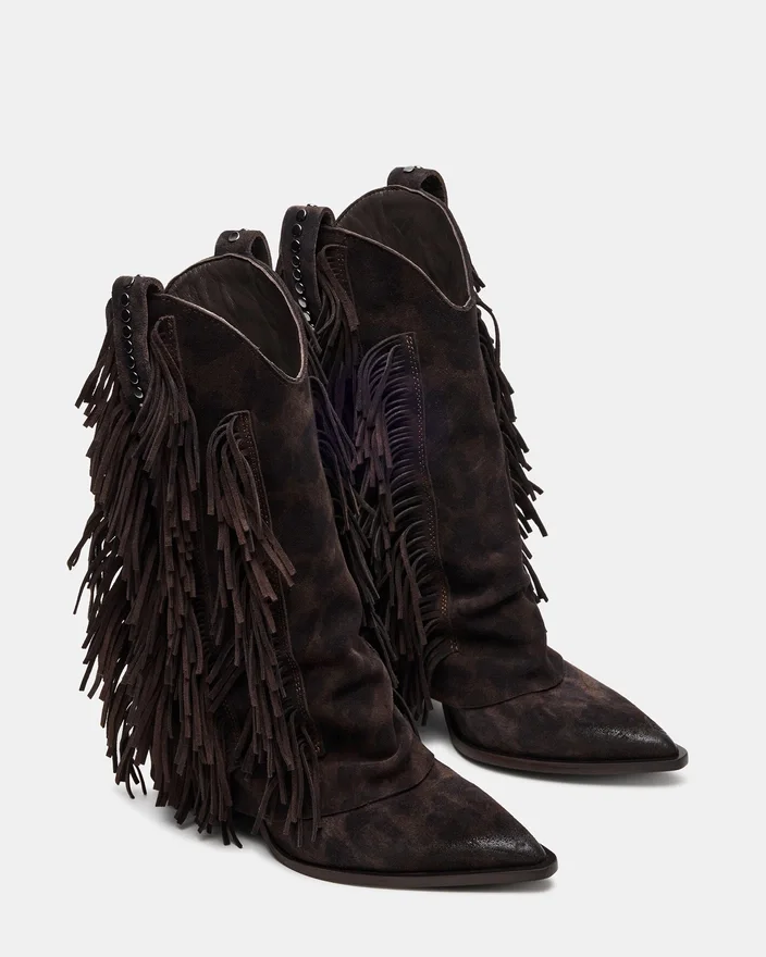 The Landmark Brown Leopard Bootie Showcases Expert Craftsmanship with a Bold Western Influence. Featuring Stylish Fringe Accents, Stud Detailing, and a Cuffed Silhouette, These Booties Offer a Distinctive Look. The Pointed Toe Enhances Their Sleek Profile, Making Them an Ideal Choice for Those Seeking a Versatile Blend of Character and Sophistication.