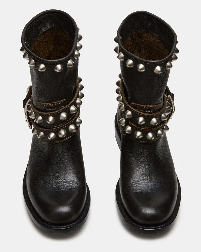 The Orbit Black Distressed Ankle Bootie Combines Edgy Moto-Inspired Design with Refined Gold Stud Detailing. Featuring a Sturdy Buckle Accent, This Ankle Boot Offers a Secure Fit and Elevates Your Style with Subtle Ruggedness. Its Distressed Finish Adds Character, Making It a Versatile Choice for a Modern, Bold Look.