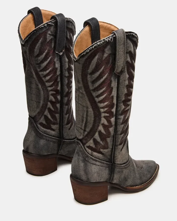 Expertly Crafted, These Albany Black Denim Boots Boast a Pointed-Toe Design and Traditional Western Style. Made from Quality Materials, These Boots Are Both Stylish and Durable. Perfect for Any Occasion, These Boots Will Elevate Any Outfit.