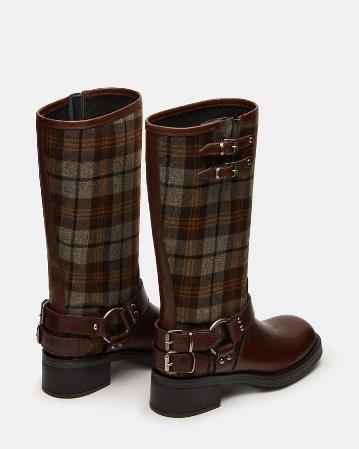 The Astor Flannel Brown Multi Square Toe Boot Features a Slouchy Mid-Calf Silhouette Reinforced with Strap Accents and Substantial Buckle Hardware. A Wide Sole with a Block Heel Provides a Solid Foundation for This Engineer-Inspired Design.