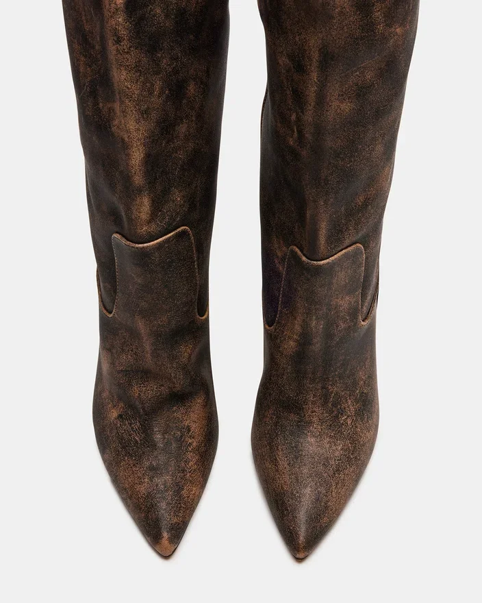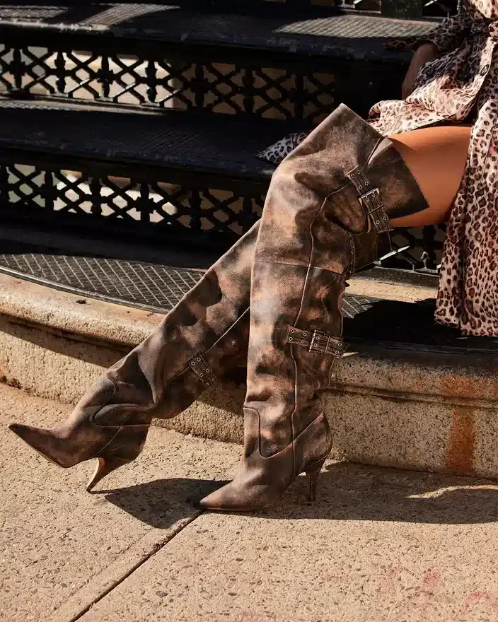 Expertly Crafted, the Baddie Boot is Both Edgy and Practical. Made with a Pointed Toe and Buckle Detail, These Over-The-Knee Heeled Boots Offer a Unique Touch to Any Outfit. Elevate Your Style with These Statement Boots.