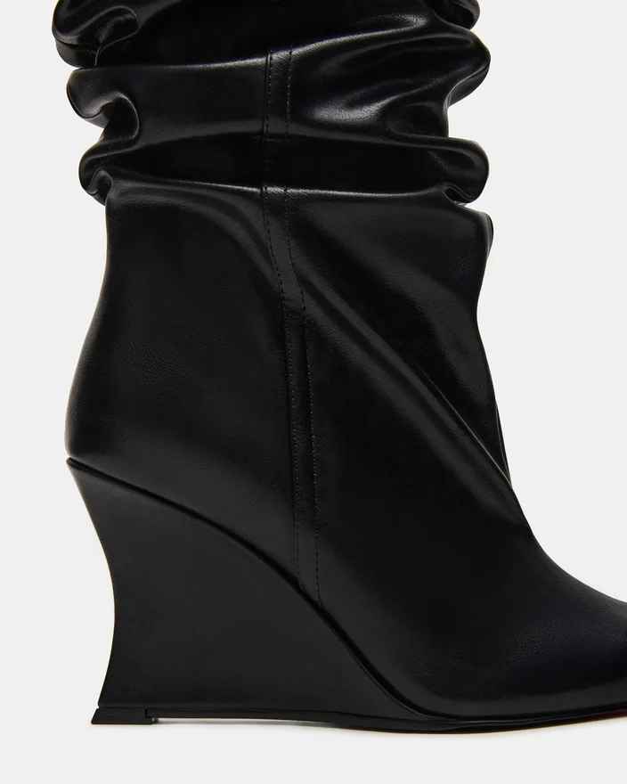 The Distortion Boot Features a Scrunched Design, Wedge Heel, and a Pointed-Toe, Extending to Knee Height for a Bold, Fashion-Forward Silhouette. Crafted to Combine Edgy Style with Comfortable Wear, This Boot Elevates Any Outfit with Its Sleek Design and Distinctive Wedge Support. Ideal for Those Seeking a Statement Piece That Balances Trend and Practicality.