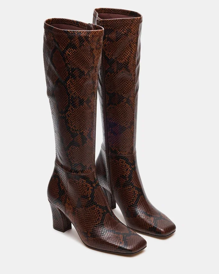 Elevate Your Footwear Collection with the Elliot Brown Snake, a Sleek Square-Toe Knee-High Boot Designed for Both Style and Stability. Featuring a Sturdy Block Heel, This Boot Offers Confident Support and a Modern Silhouette. Its Tall Shaft Provides Versatile Coverage That Pairs Effortlessly with Various Outfits, Making It a Sophisticated Choice for Any Occasion.