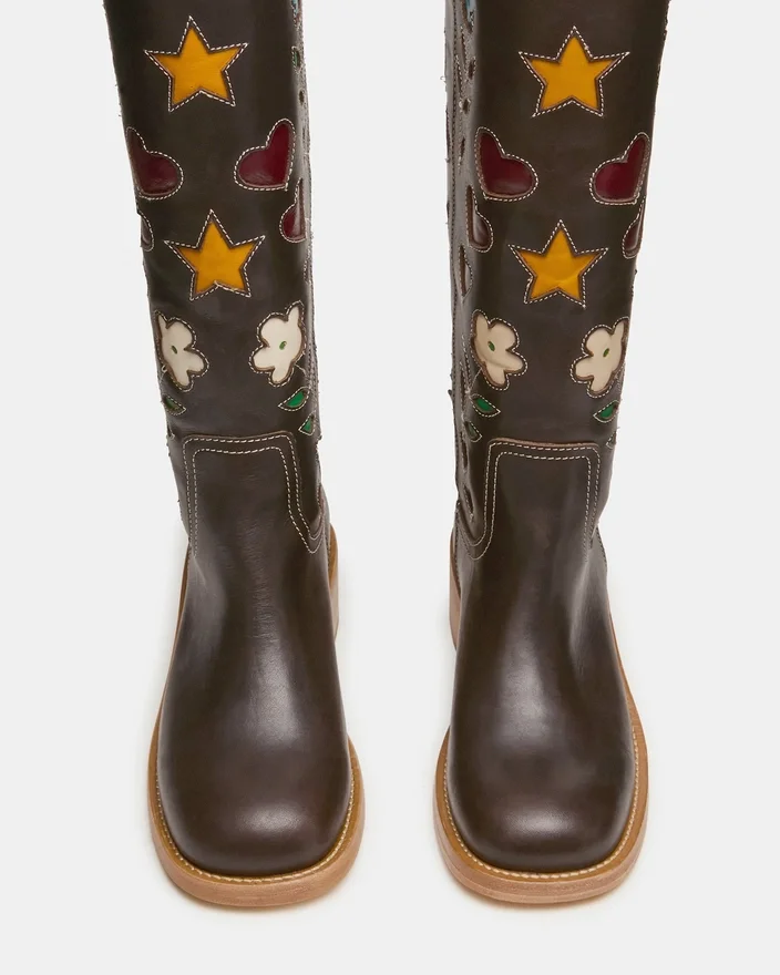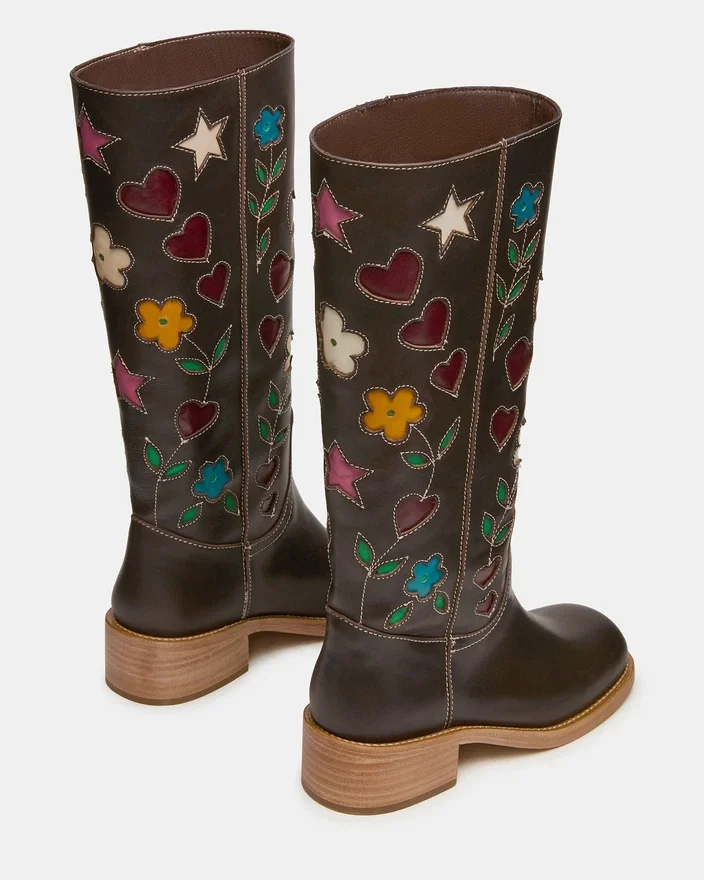 Effortlessly Elevate Your Style with the Riggs Floral Brown Leather Boot. With Its Square-Toe and Sleek Design, This Just-Under-The-Knee Boot is a Must-Have for Any Fashion-Conscious Individual. This Timeless Boot Provides Both Comfort and Sophistication, Making It the Perfect Addition to Any Outfit.