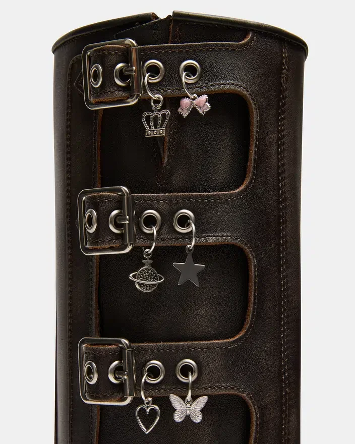 The Rocky Charms Brown Distressed Knee Boot Features the Wide Profile of an Engineer Boot with Harness and Buckle Hardware Adding an Industrial Edge and Giving the Design an Adjustable Fit.
