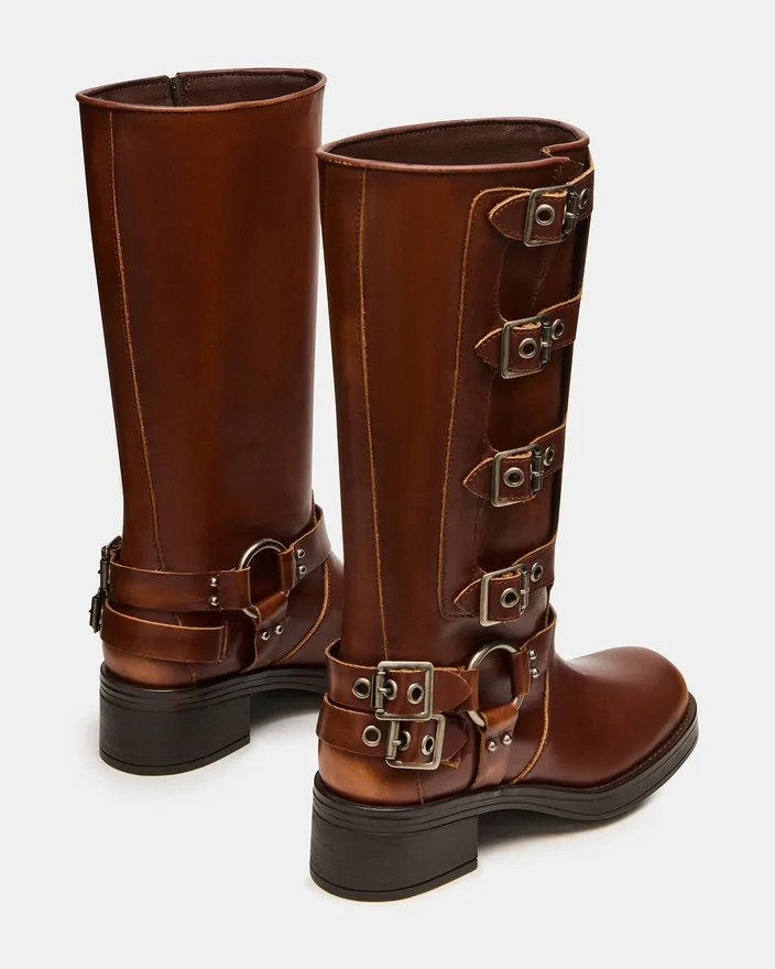 The Rocky Cognac Distressed Knee Boot Features the Wide Profile of an Engineer Boot with Harness and Buckle Hardware Adding an Industrial Edge and Giving the Design an Adjustable Fit.