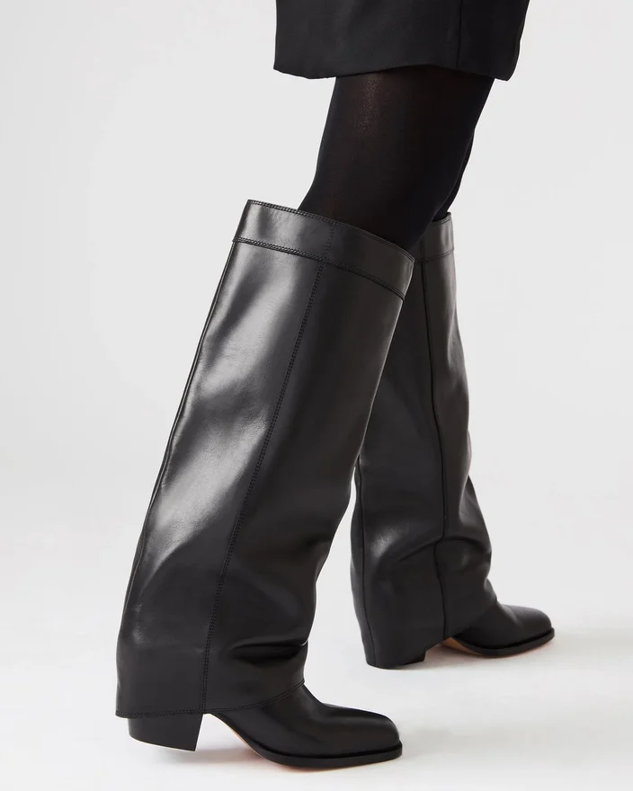 Elevate Your Footwear Collection with the Winnick Olive Leather Boot, Featuring a Sophisticated Cuffed Fold-Over Design That Reaches the Knee for a Statement Look. Crafted with a Modern Square-Toe and Supported by a Sturdy Block Heel, This Boot Combines Style with Stability, Making It Ideal for All-Day Wear. The Construction Offers Durability and a Sleek Finish, Perfect for Pairing with Both Casual and Tailored Outfits.