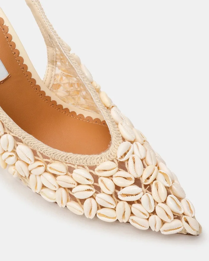 Introducing the Andromeda Shell Natural Pump. This Elegant Heel Features a Pointed-Toe Design and Stiletto Heel for a Sophisticated Look. The Slingback Strap Provides a Secure Fit While the Unique Design Adds a Touch of Luxury. Perfect for Any Formal Occasion, These Heels Will Elevate Your Outfit to the Next Level.