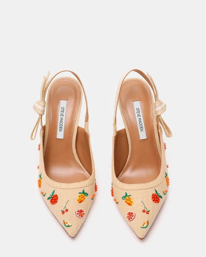 A Grosgrain Ribbon Wraps Around the Slingback Strap of the Bri Raffia Fruit Multi Point Toe Stiletto Pump and Finishes with a Bow Accenting the Side of the Shoe.