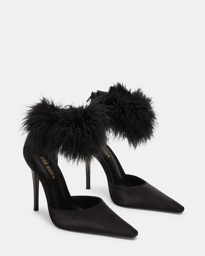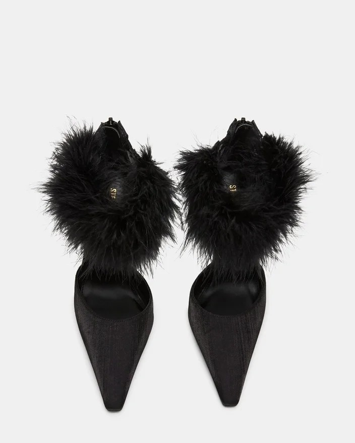 Elevate Your Style with the Elusive Black Satin Pump, Featuring a Sleek Pointed-Toe Silhouette Paired with a Slender Stiletto Heel for Timeless Sophistication. The Delicate Feather Ankle Strap Adds a Unique, Refined Touch That Enhances Both Elegance and Comfort, Making This Shoe an Exquisite Choice for Occasions That Demand a Standout Accessory. Crafted to Combine Grace and Modern Flair, It’s Perfect for Those Seeking a Statement Piece That Complements Any Chic Ensemble.