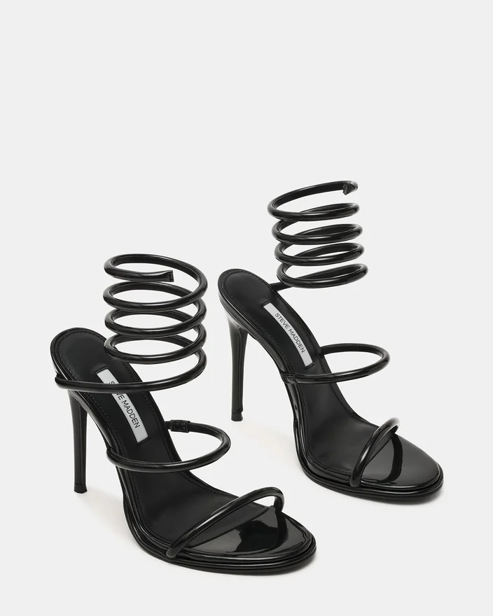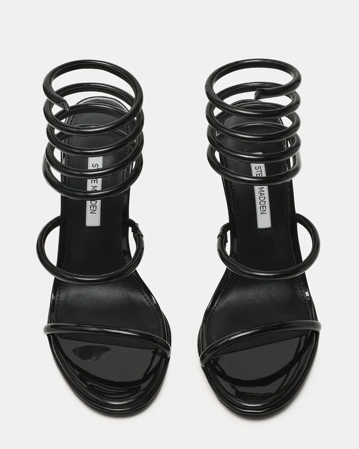 Add a Touch of Luxury to Your Wardrobe with Exotica Black Patent. This Stiletto Sandal with a Strappy Wrap Around the Leg Provides a Unique Look and Feel That Stands out in Any Crowd.
