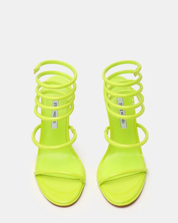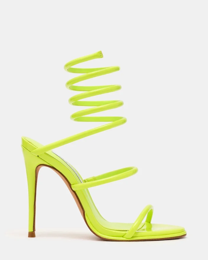 Add a Touch of Luxury to Your Wardrobe with Exotica Lime Patent. This Stiletto Sandal with a Strappy Wrap Around the Leg Provides a Unique Look and Feel That Stands out in Any Crowd.