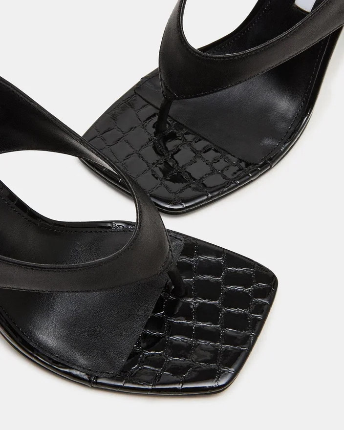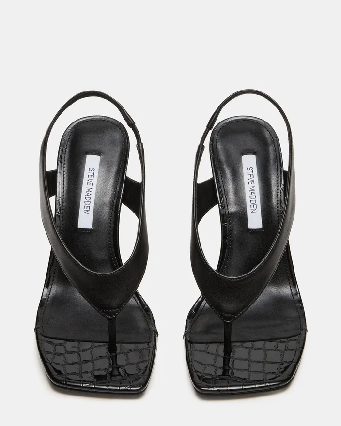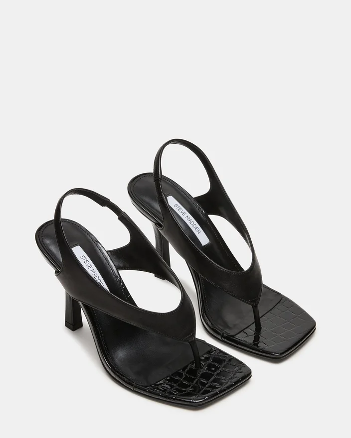 The Improv Black Leather Combines a Sophisticated Square-Toe Silhouette with a Secure Slingback Design, Delivering Both Style and Stability. This Thong Sandal Features a Refined Heel That Elevates Your Everyday Look While Maintaining Comfort for All-Day Wear.