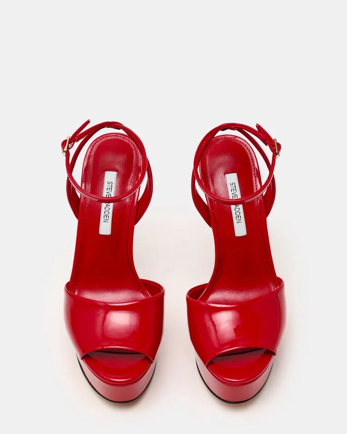 The Jezzica Red Patent Combines a Striking Stiletto Heel with a Secure Ankle Strap for Refined Elegance and Stability. This Platform Heel Creates a Polished, Statement-Making Look. Perfect for Occasions Demanding Sophisticated Style and Confident Presence.