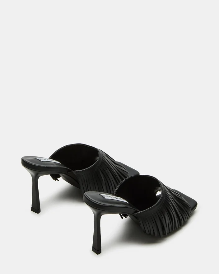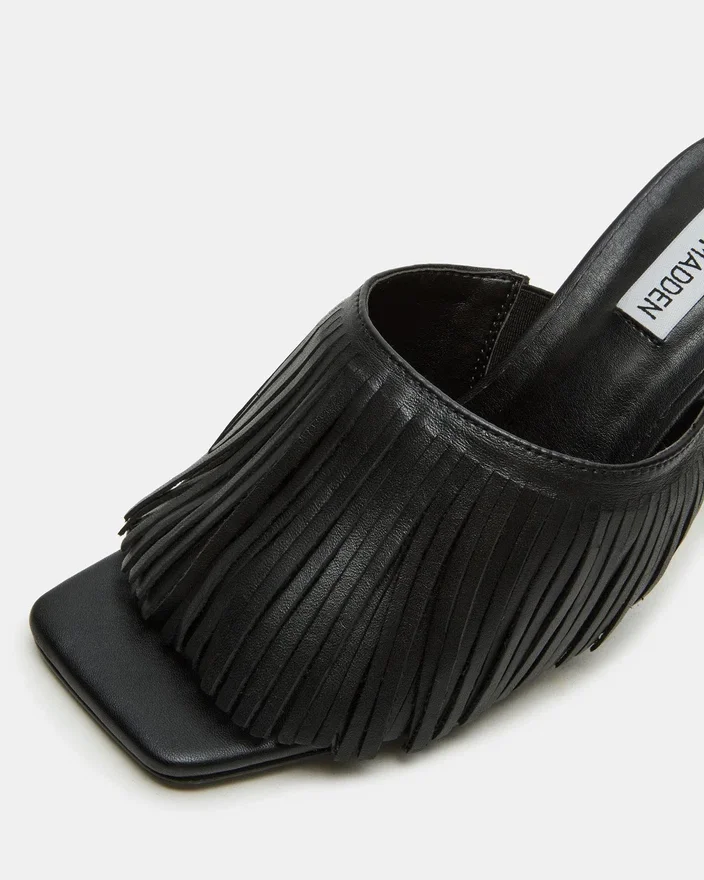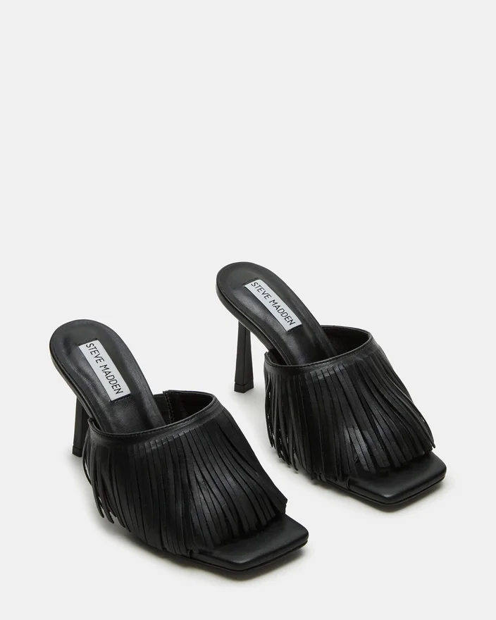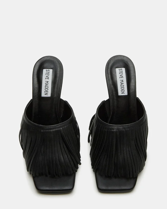 Expertly Crafted with a Sleek Square-Toe and Stiletto Heel, the Morina Mule Heel Offers a Touch of Sophistication to Any Outfit. The Open Toe and Fringe Design Add a Unique Flare, Making It a Versatile and Chic Addition to Your Wardrobe.