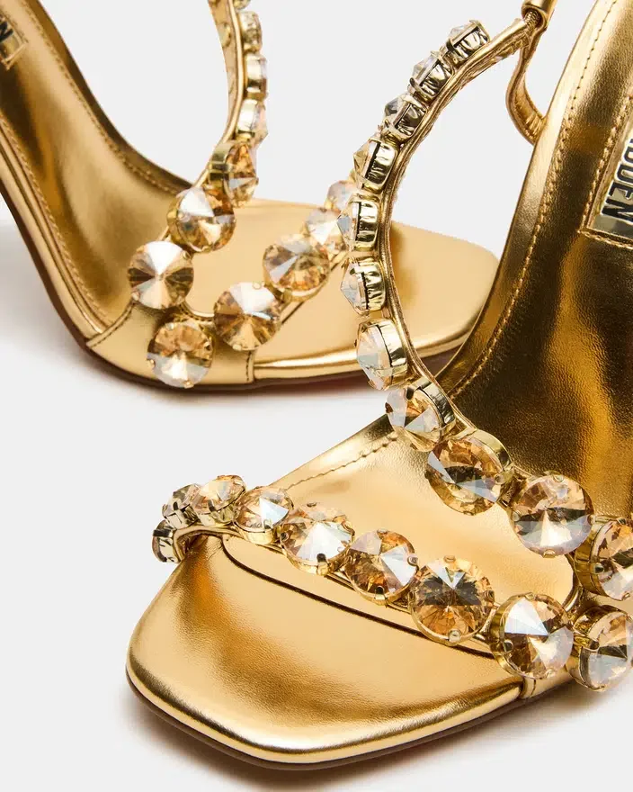Elevate Your Style with the Nylie Gold Multi, Featuring a Sleek Square-Toe Strappy Design and a Slender Stiletto Heel Adorned with Exquisite Embellishments. This Sophisticated Silhouette Combines Elegance and Sparkle, Perfect for Making a Statement at Any Event. The Delicate Straps Ensure a Secure Fit While Highlighting Your Foot, Offering Both Allure and Confidence in Every Step.