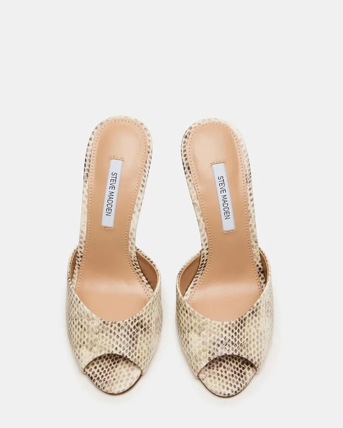 The Priya Natural Snake Sandal Pairs a Slender Stiletto Heel with a Retro-Inspired Peep Toe Design on the Slide Strap at the Front.