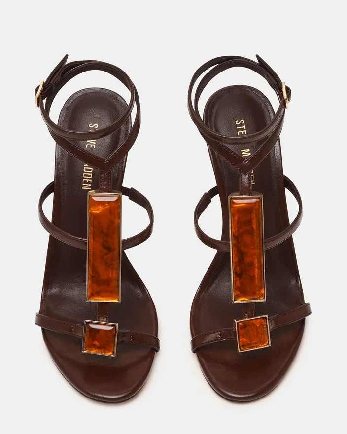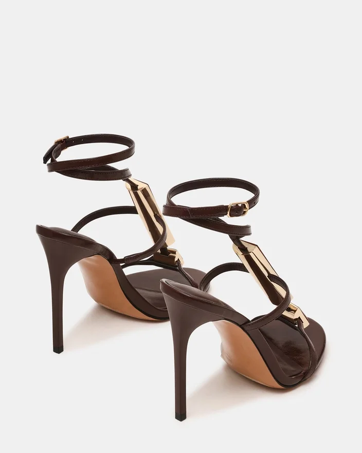 The Shaylee Brown Delivers Timeless Sophistication with Its Sleek Stiletto Heel and Refined Stone Design. Delicate Straps Wrap the Foot While an Ankle Strap Provides Secure Support and Elegant Definition. This Versatile Design Transitions Seamlessly from Evening Events to Upscale Occasions, Offering a Polished Silhouette.