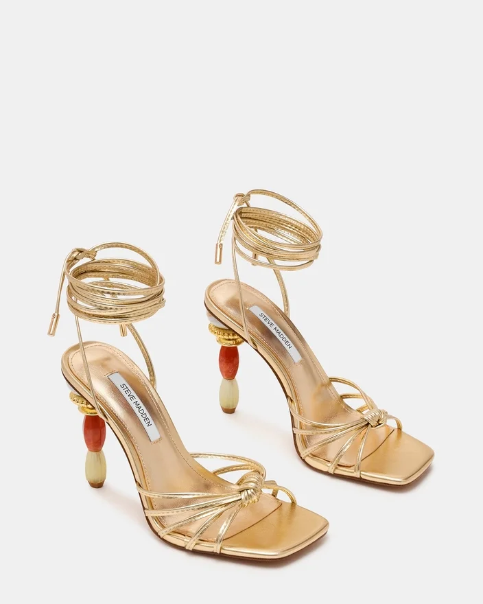The Solena Gold is a Strappy Heel Featuring a Sculptured Silhouette and Architectural Square Toe. The Leg-Tie Design Creates an Elegant, Adjustable Fit That Flatters the Ankle While Offering Customizable Styling Versatility. The Refined Heel Structure Provides Confident Support and a Polished Aesthetic Suitable for Elevated Occasions and Contemporary Wardrobes.