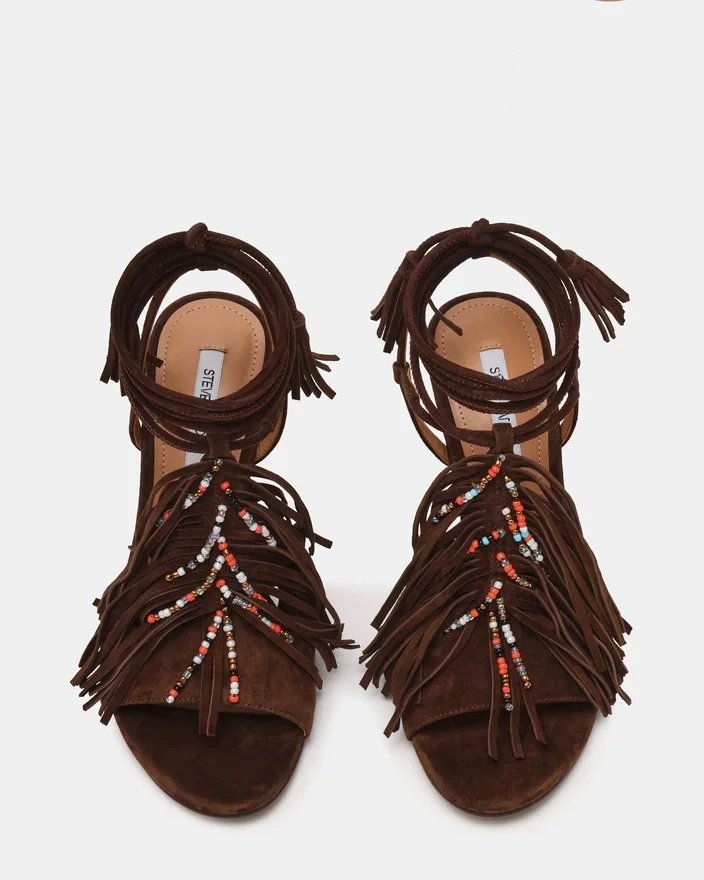 The Talia Brown Suede Stiletto Heel Combines Architectural Design with Luxurious Embellishment. Cascading Fringe Movement Adds Dynamic Texture, Complemented by Intricate Bead Detailing That Catches Light with Every Step. The Refined Stiletto Heel Delivers Both Elevation and Elegance, Making This an Essential Choice for Those Who Appreciate Sophisticated Footwear Craftsmanship. Perfect for Occasions Demanding Standout Style and Refined Execution.