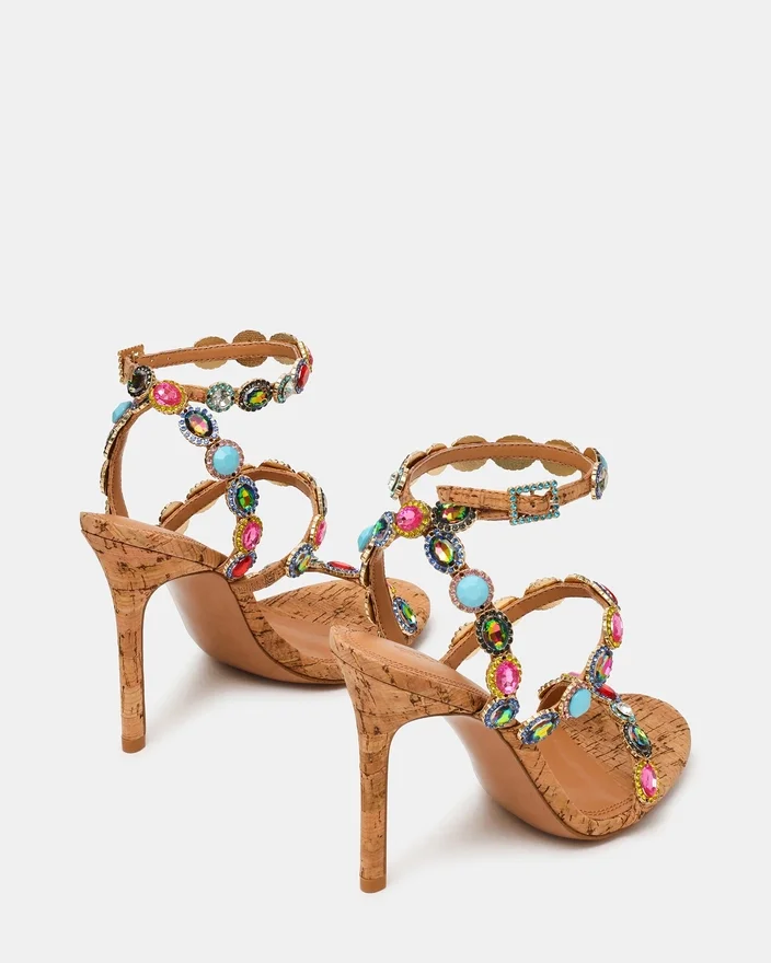 Elevate Your Style with the Tamala Cork Bright Multi Heel, Featuring a Multi-Colored Stone Design That Adds Vibrant Sophistication to Any Outfit. The Open Round Toe Offers a Modern Touch and Comfortable Fit, While the Secure Ankle Strap Ensures Stability for All-Day Wear. Perfect for Dressing up or Making a Statement at Special Occasions.