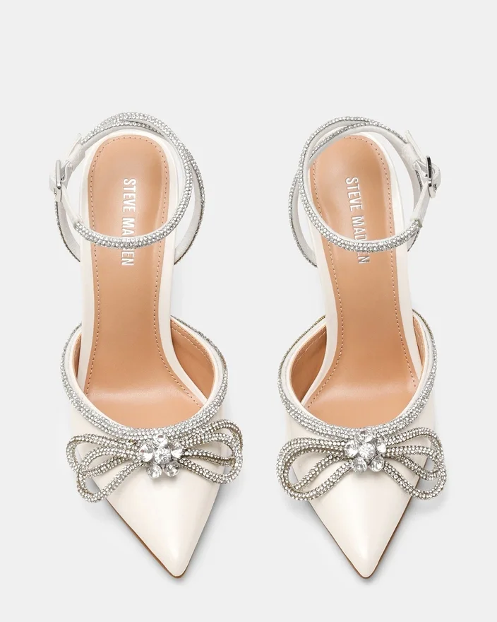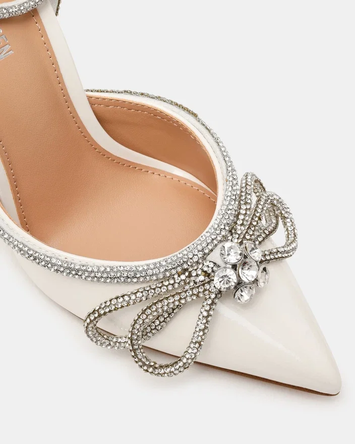 You’ll Be the Bell of the Ball in Viable, the Dress Heel You’ll Wear for Years to Come. Set Atop a Slender Stiletto Heel, This Pointed-Toe Pair Features a Slim Rhinestone-Embellished Ankle Strap and Bow Design.